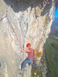 Diese Linie zählt zweifellos zu den bedeutendsten im gesamten Sarcatal. Ernste und anhaltend schwierige Kletterei an Rissen, Verschneidungen und Schuppen an einem fast durchwegs überhängenden Pfeiler sind so die groben Attribute dieser kingline. Teilweise war ich da auch gar nicht so schlecht unterwegs, aber in einigen Seillängen fragte ich mich schon, was ich da zu verloren hätte 😉. Wie man allerdings hier rotpunkt raufkommt, alle Sicherungen dabei selbst legen muss und noch mit einem Dauergrinser unterwegs sein kann, bleibt mir ein Rätsel.