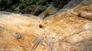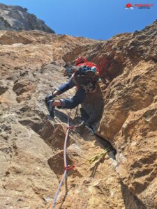 lohnendsten Routen in der Umgebung sein. Die Erstbegeher haben hier eine wunderbar logische Linie mit einigen sehr spektakulären Seillängen im besten Fels gefunden. Trotz guter Absicherung mit Bohr- und Normalhaken empfiehlt sich zur Mitnahme ein Satz friends. Wir genossen den warmen Fels und das beste Kletterwetter. Peter stieg die schweren Längen souverän vor und kletterte auch die Schlüsselstelle im obersten Bereich frei- ein perfekter Beginn!