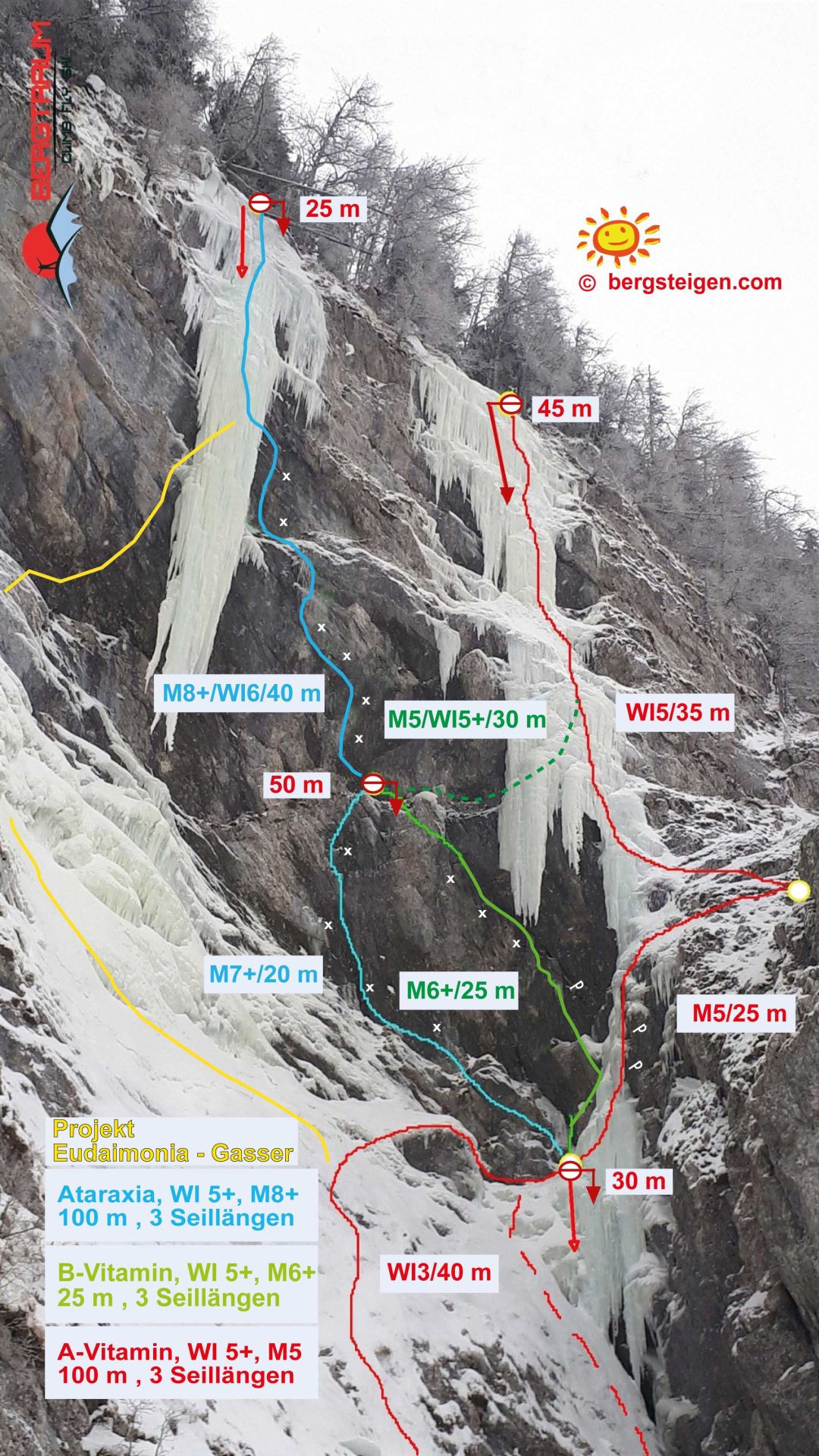 Bemerkungen: Die Routen bei Ataraxia oben sind westlich ausgerichtet. Selten gutes und ausreichendes Eis. Meist wird delikat an dünnen Glasuren geklettert. Einige Varianten dort sind entweder im Mixed- oder Drygelände recht gut eingebohrt. Die originale B- Vitamin Länge geht vom ersten Stand anfangs nach RECHTS, dann unter die markante Dachverschneidung nach links zum identen Stand wie vor. Vorsicht- der Ataraxia Zapfen steht genau über der Zustiegslänge.