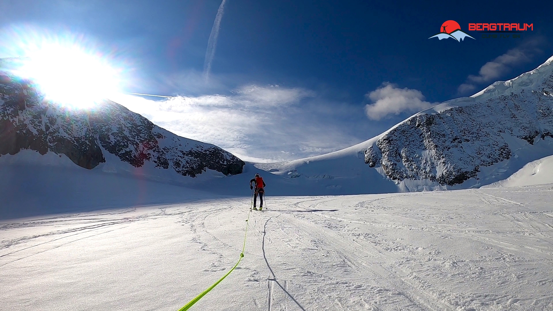Wir starteten mit Turnschuhen und dem Tourenskizeugs am Rücken beim Lucknerhaus. Knapp eine Stunde später wechselten wir auf die Ski und zogen alleine dem Glocknergipfel entgegen. Beim Skidepot am Leitl angekommen, fragte ich mich schon zum wiederholten Mal, was Andi eigentlich aufholen wollte. Der Junge zog nach oben hin davon, als hätte er bis dato nichts anderes gemacht. Mit dem umgehängten Seil (Andi wollte eins mitnehmen…) versuchte ich hinterher zu keuchen.