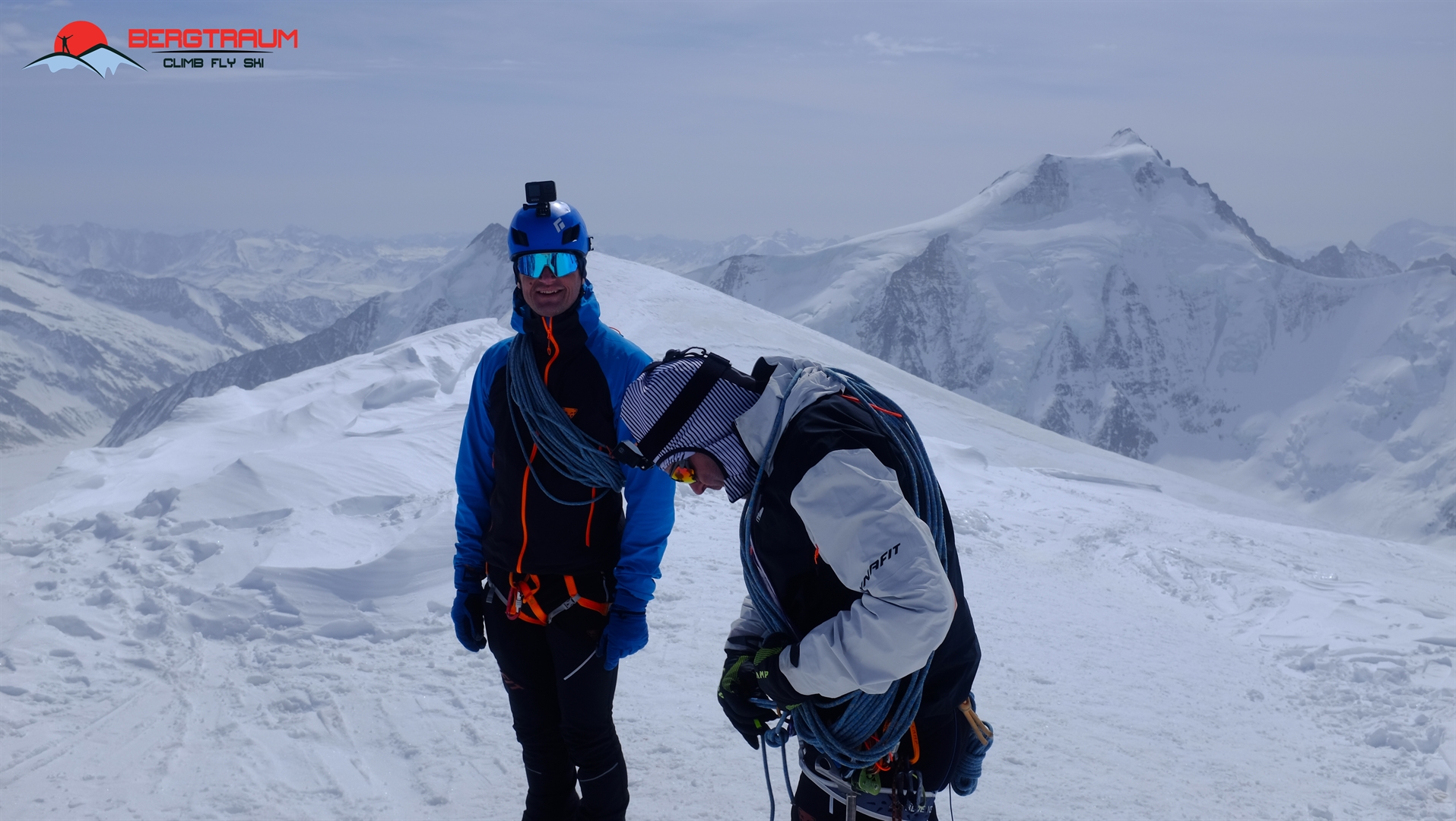Ausrüstung: Hochtourenausrüstung, Lawinenzeugs im Winter, kurzes Seil (30 m) für Gletscher und Grat, Sicherungsmaterial.