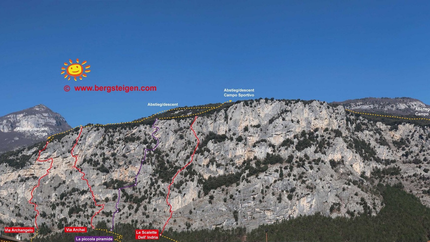 Abstieg: Vom Ausstieg wenige Meter durch den Wald aufwärts bis zu einem alten Forstweg. Diesen weiter nach Norden verfolgen. Den folgenden Fussweg entlang des Wandabbruchs nach Norden weiter, über den "Percorso delle Cavre" nach Lastoni und über den „Sentiero dell’ Anglone“ hinunter zum Sportplatz (Hinweistafeln).