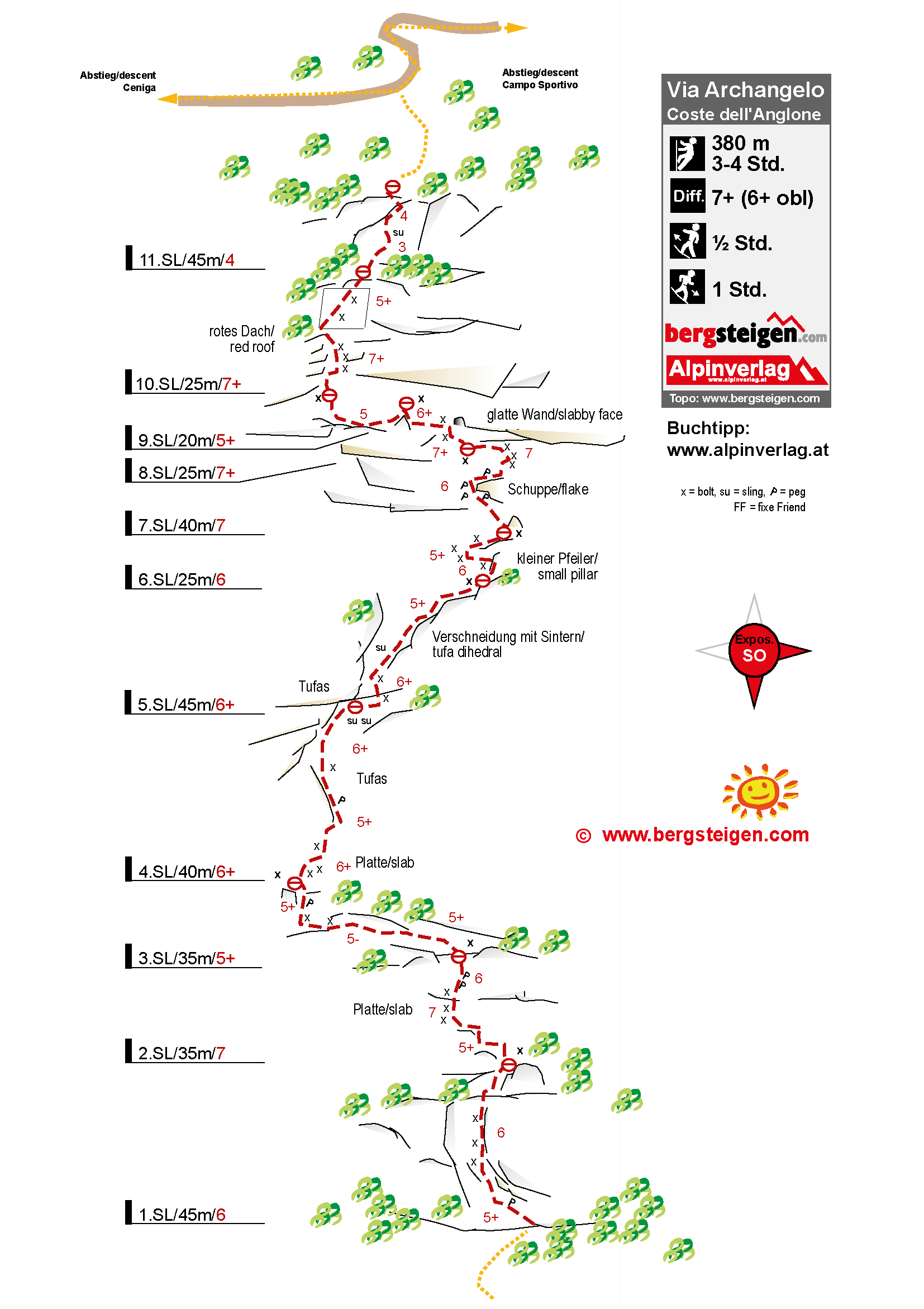 „Via Archangelo“/ Coste dell` Anglone: VII+ (VI+ obl.). Im Einzelnen: VI (45 m), VII (35 m), V+ (35 m), VI+ (40 m), VI+ (45 m), VI (25 m), VII (40 m), VII+ (25 m), V+ (20 m), VII+ (25 m), IV (45 m).