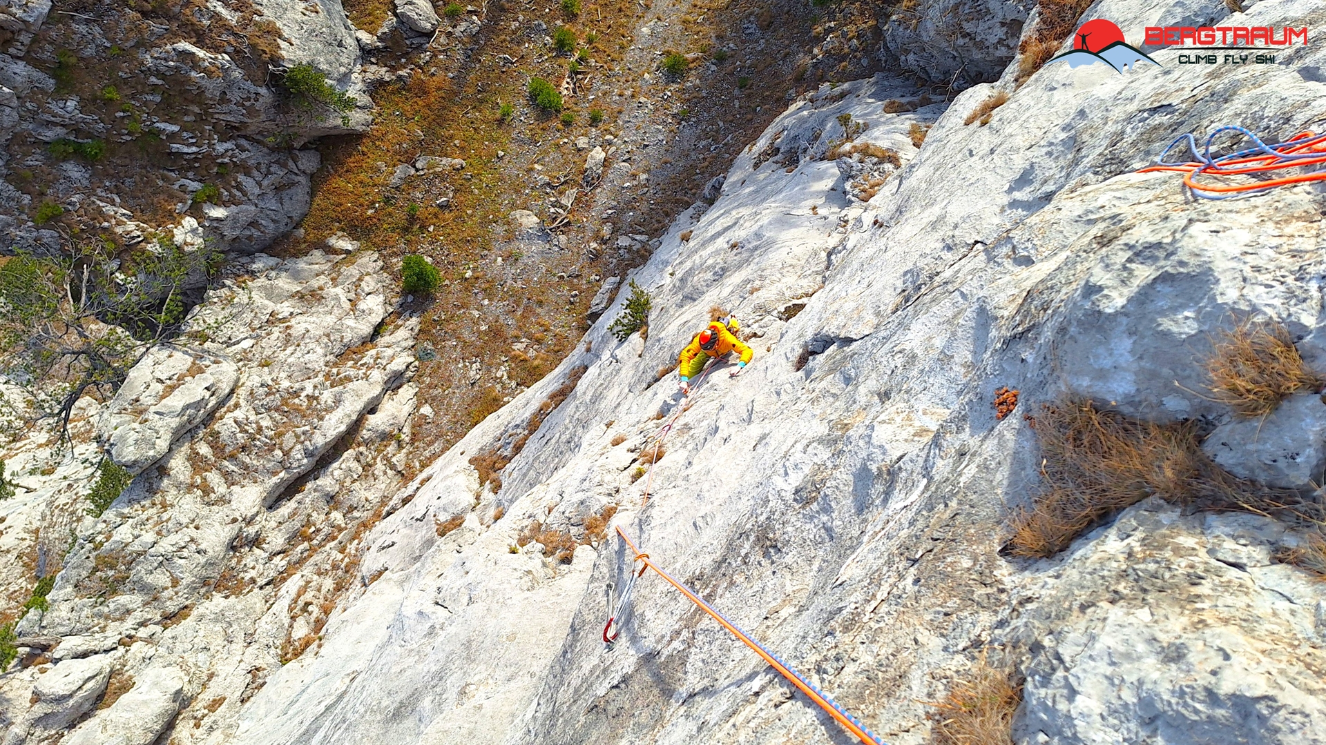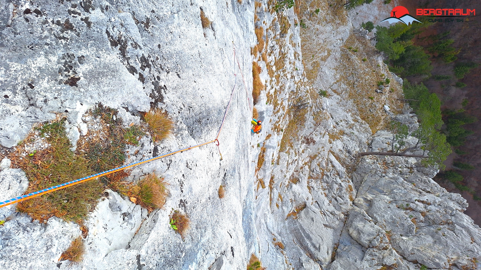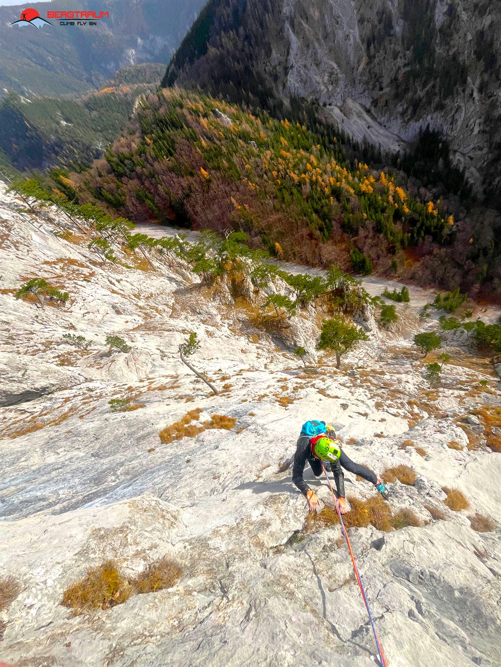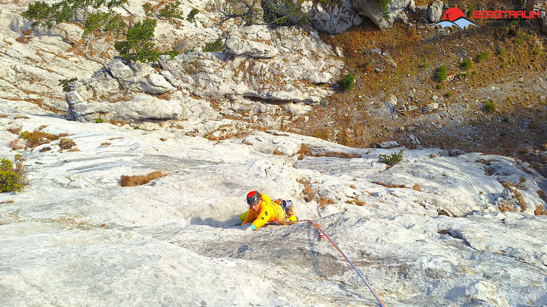 L10- VI+: zu Beginn deutlich nach rechts, dann die Platte gerade rauf und final nch links zum Standplatz hinüber.