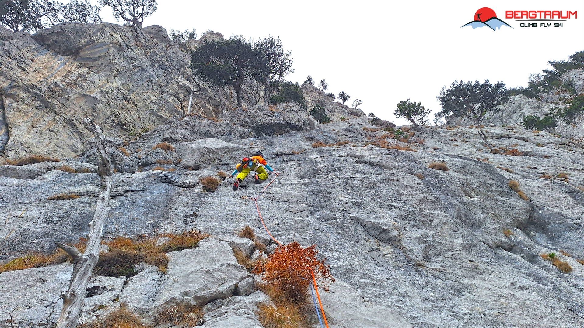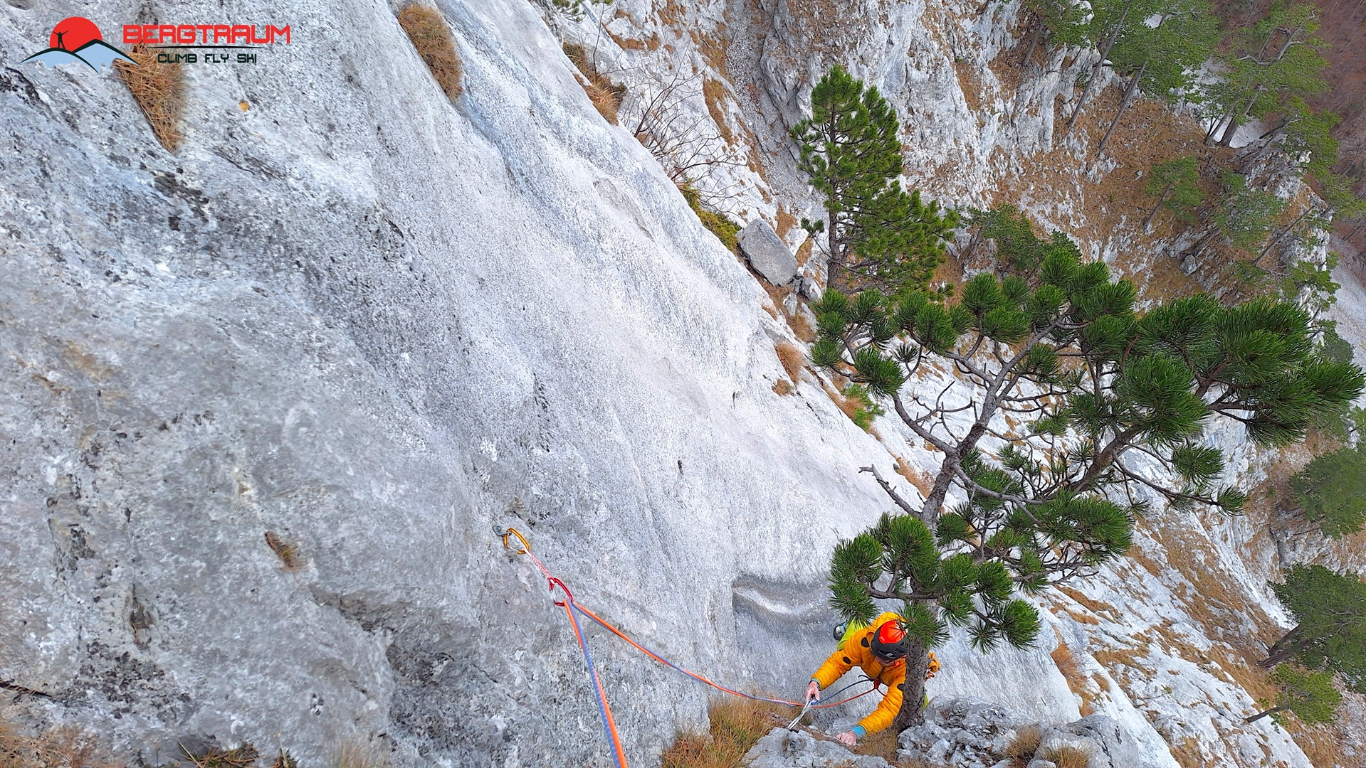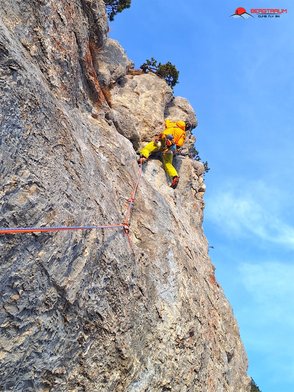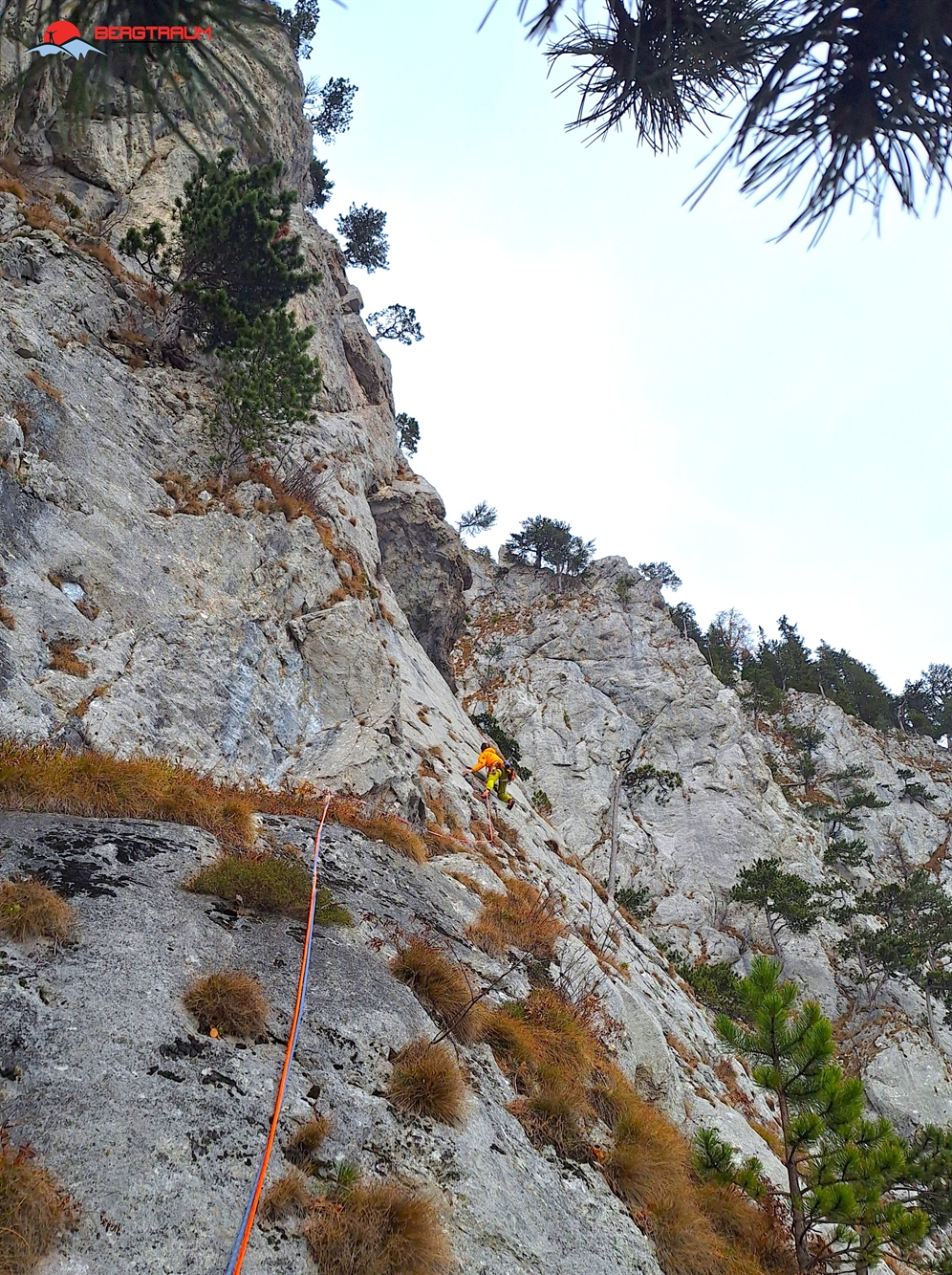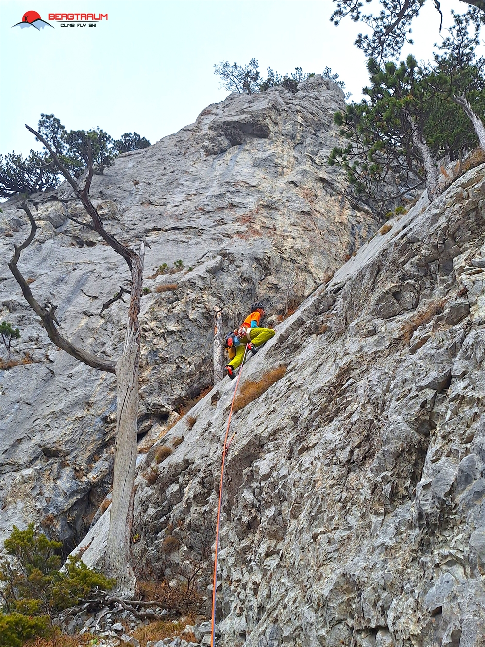 L6- VII-: anfangs markant nach links zu morschem Baum, dann über eine herrliche Wasserrillenplatte hinauf zum Stand bei Baum.