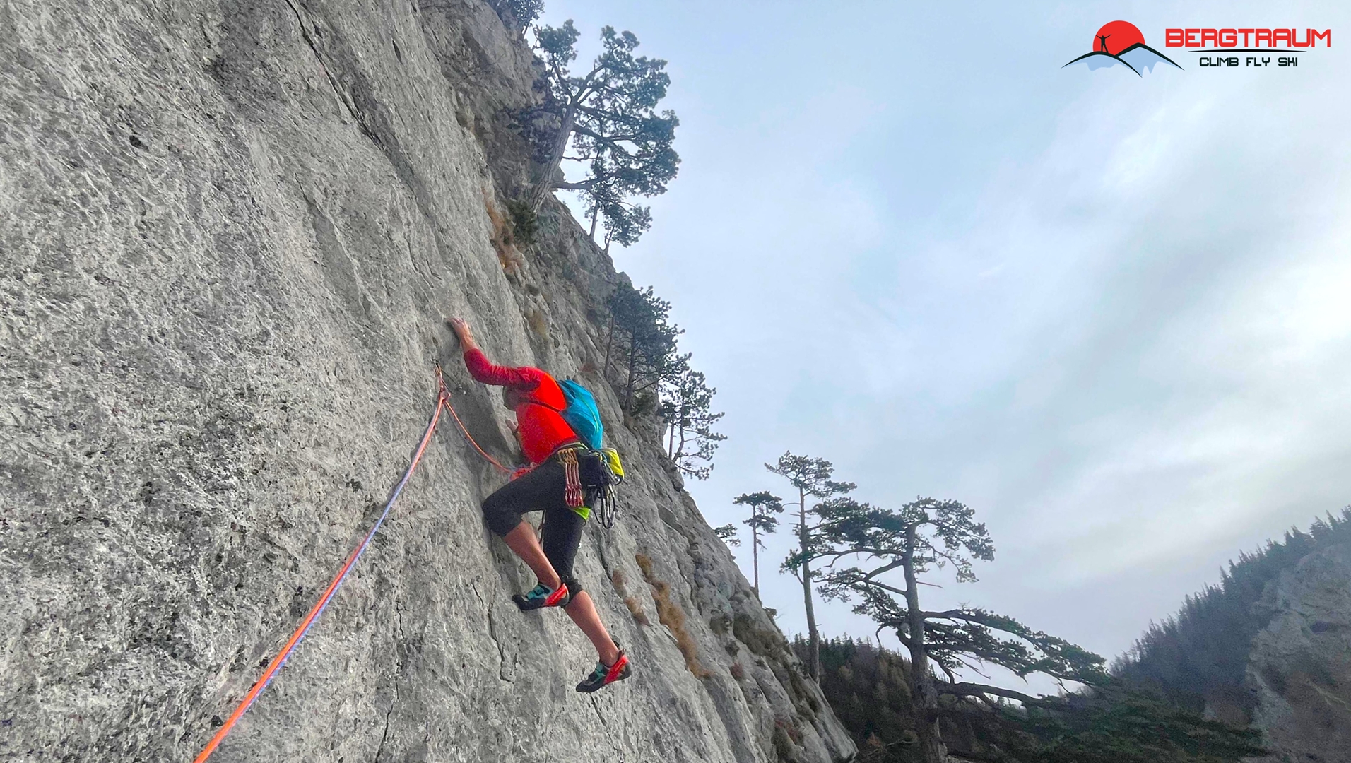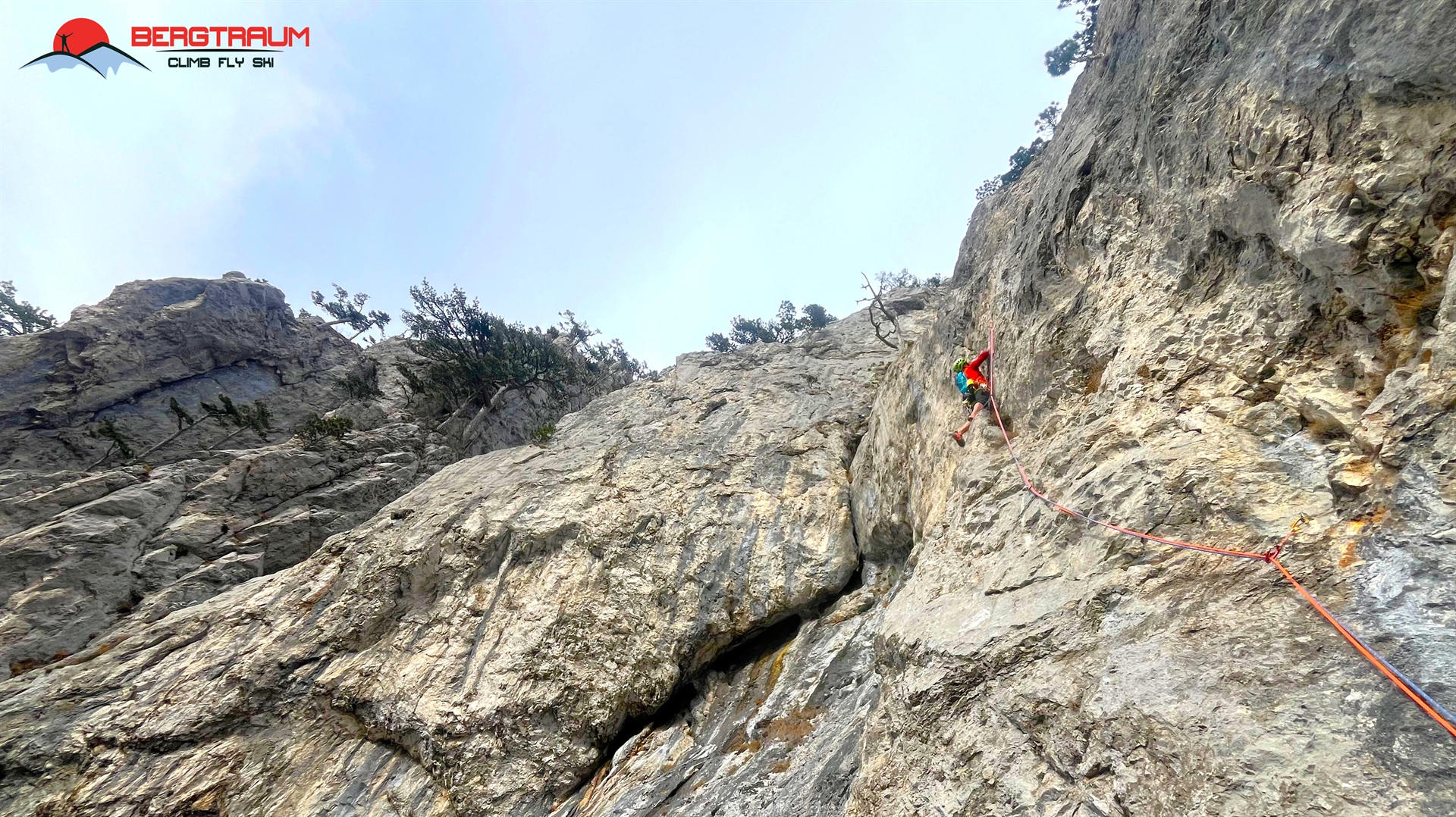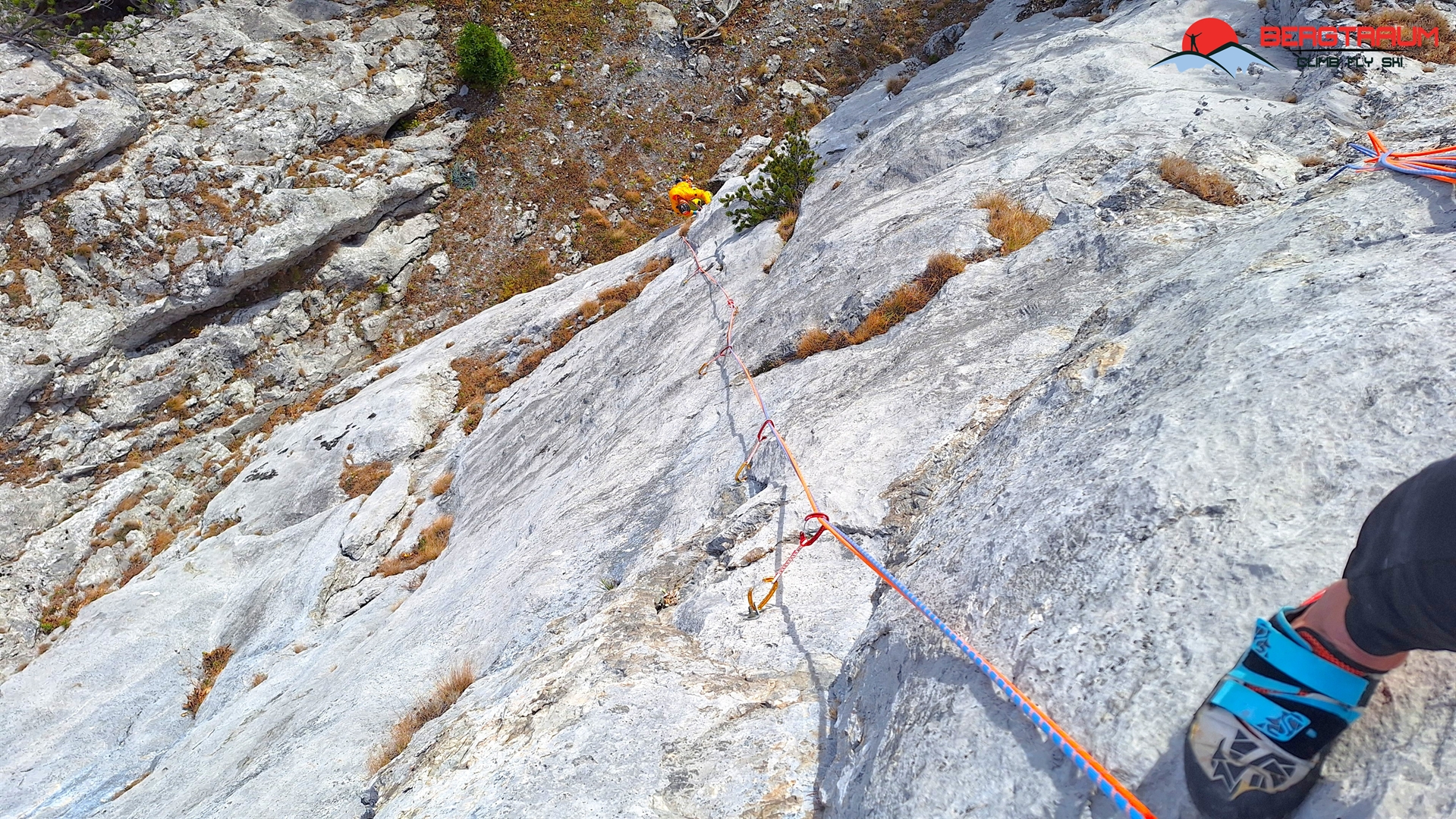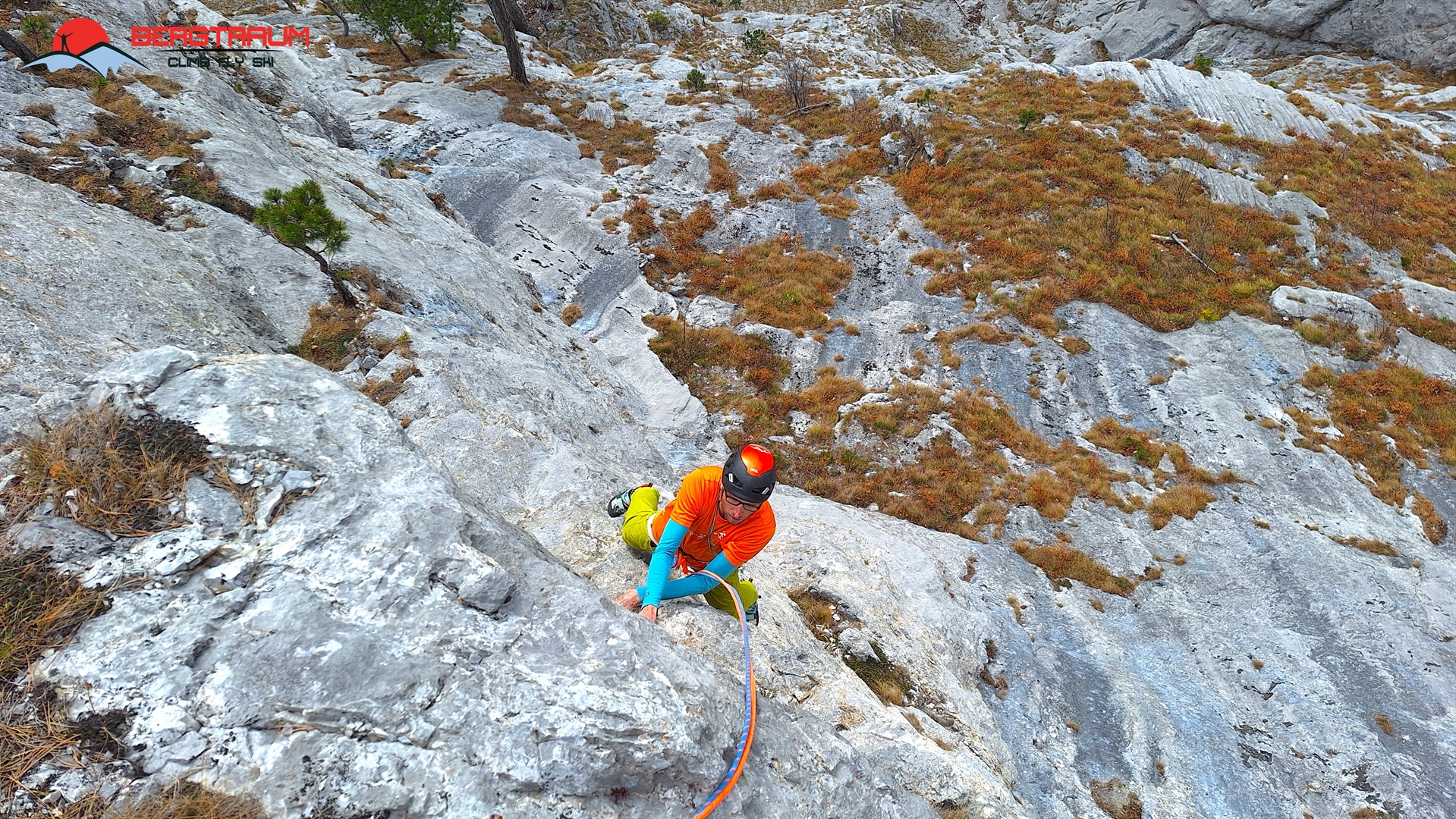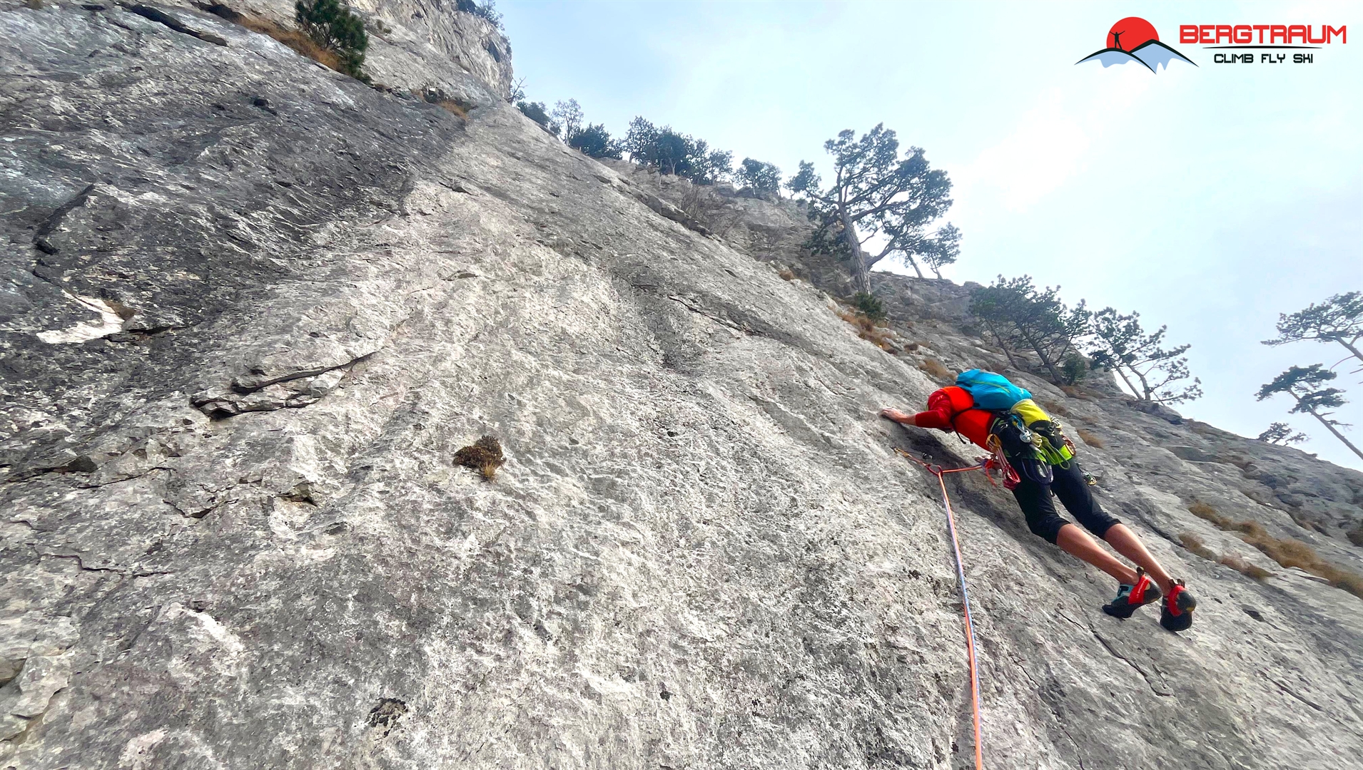 L6- VII-: anfangs markant nach links zu morschem Baum, dann über eine herrliche Wasserrillenplatte hinauf zum Stand bei Baum.