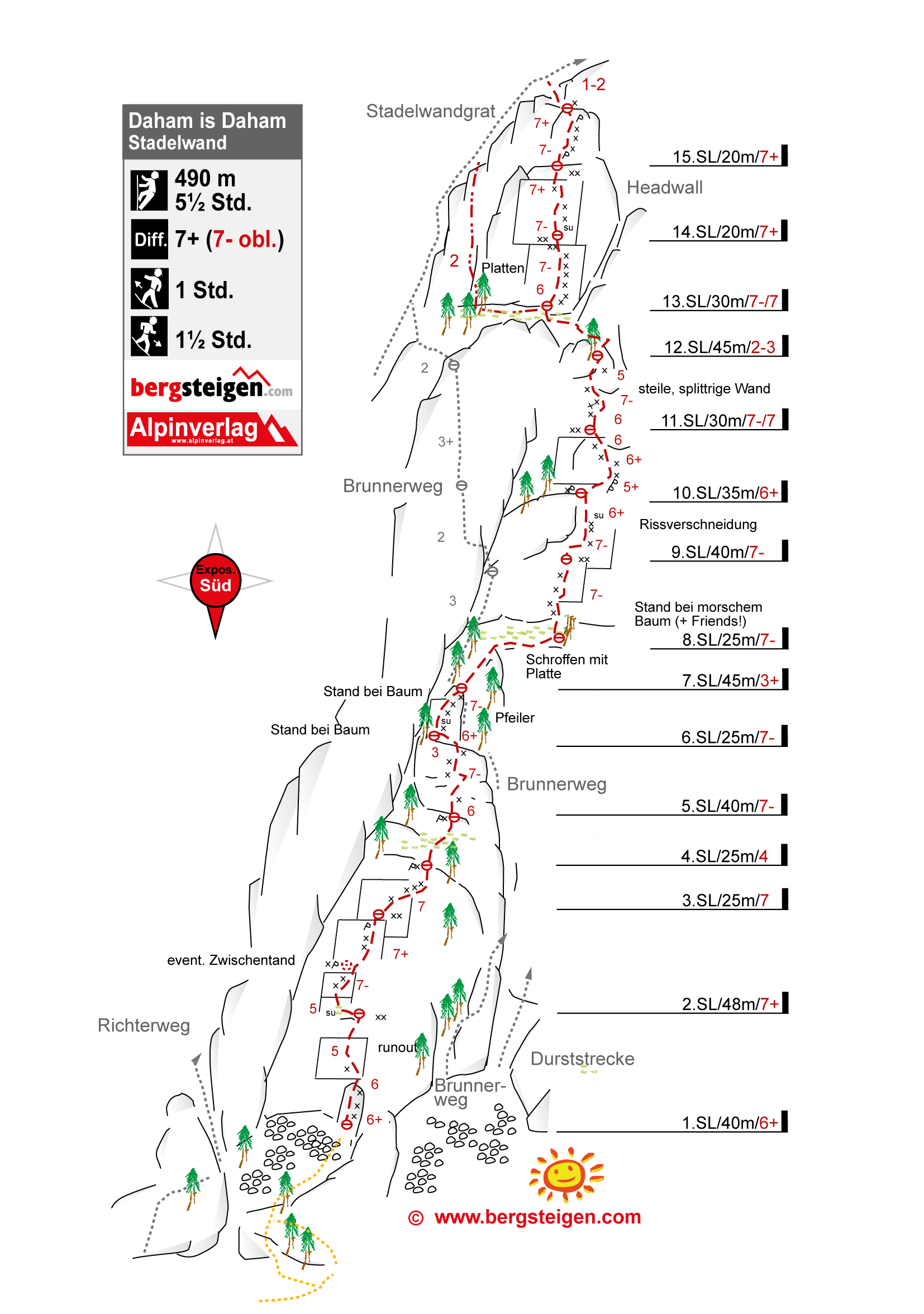 Ausrichtung Süd. Gesamt 15 Seillängen, 500 Klettermeter, Wandhöhe 350 Meter, Zustieg 1 Stunde, Kletterei 5 bis 6 Std, Abstieg 1 Stunde. Gesamt 750 Hm, 8 Stunden