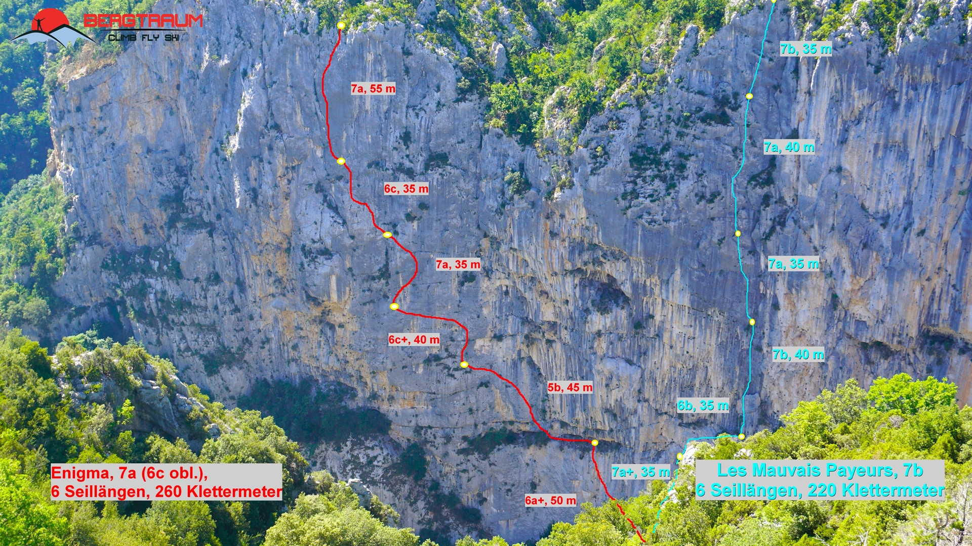 Zustieg: PP an der Auberge des Cavaliers an der orografisch linken Schluchtseite des Verdons. Rund 50 Meter westlich des PP die Strasse entlang zum Sentier des Cavaliers und steil runter Richtung Fluss (rot markiert). Am orografisch linken Flussrand Richtung Westen nach der markanten Fußgängerbrücke für rund 5 Minuten weiter, dann steil nach links oben hinauf. Ein weißes Schuttfeld nach rechts oben queren bis zum Fuß der Felswand. Kurz noch an der Wand im Wald weiter zum Einstieg (am Fels Initiale „E“- Enigma).