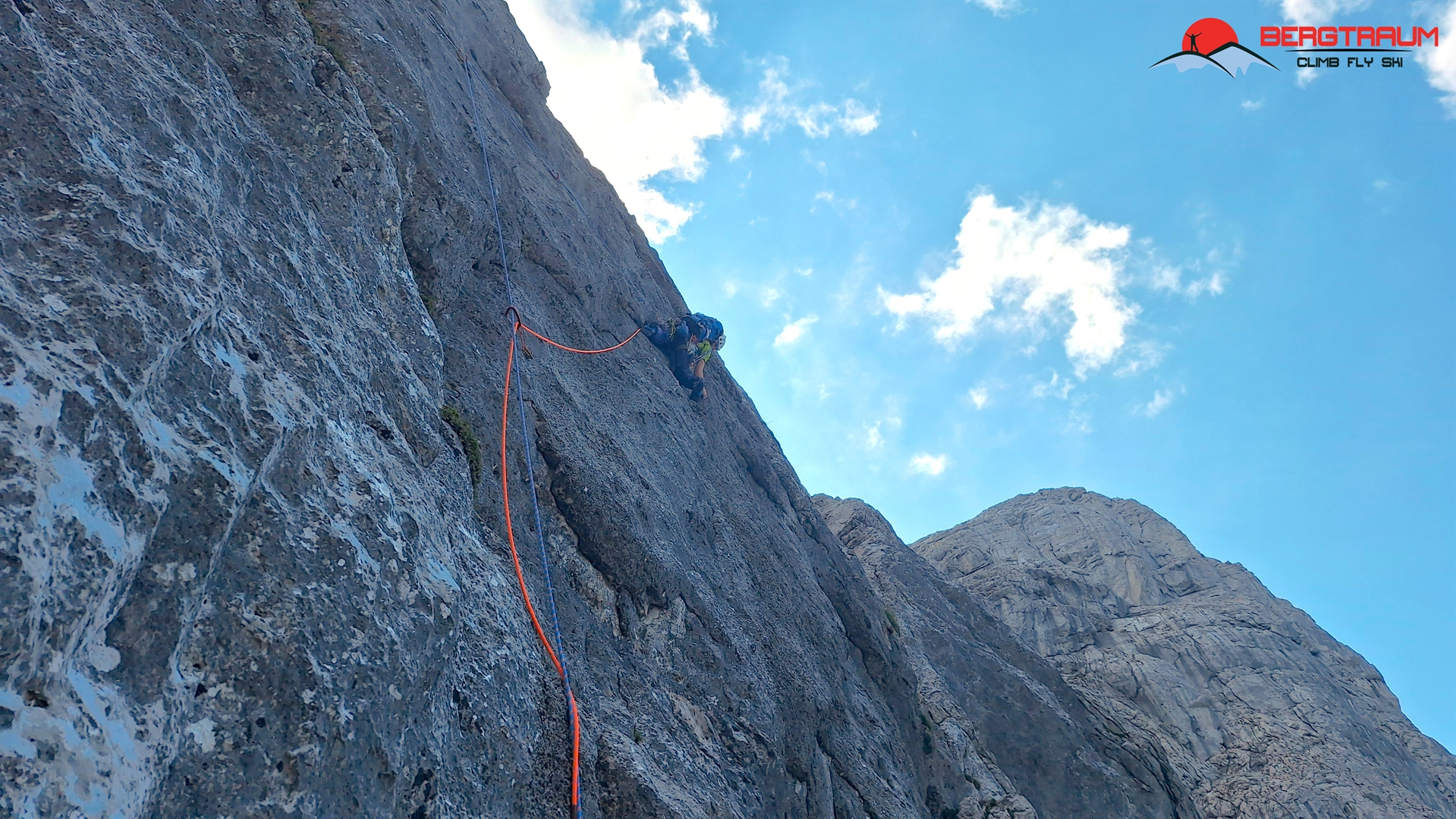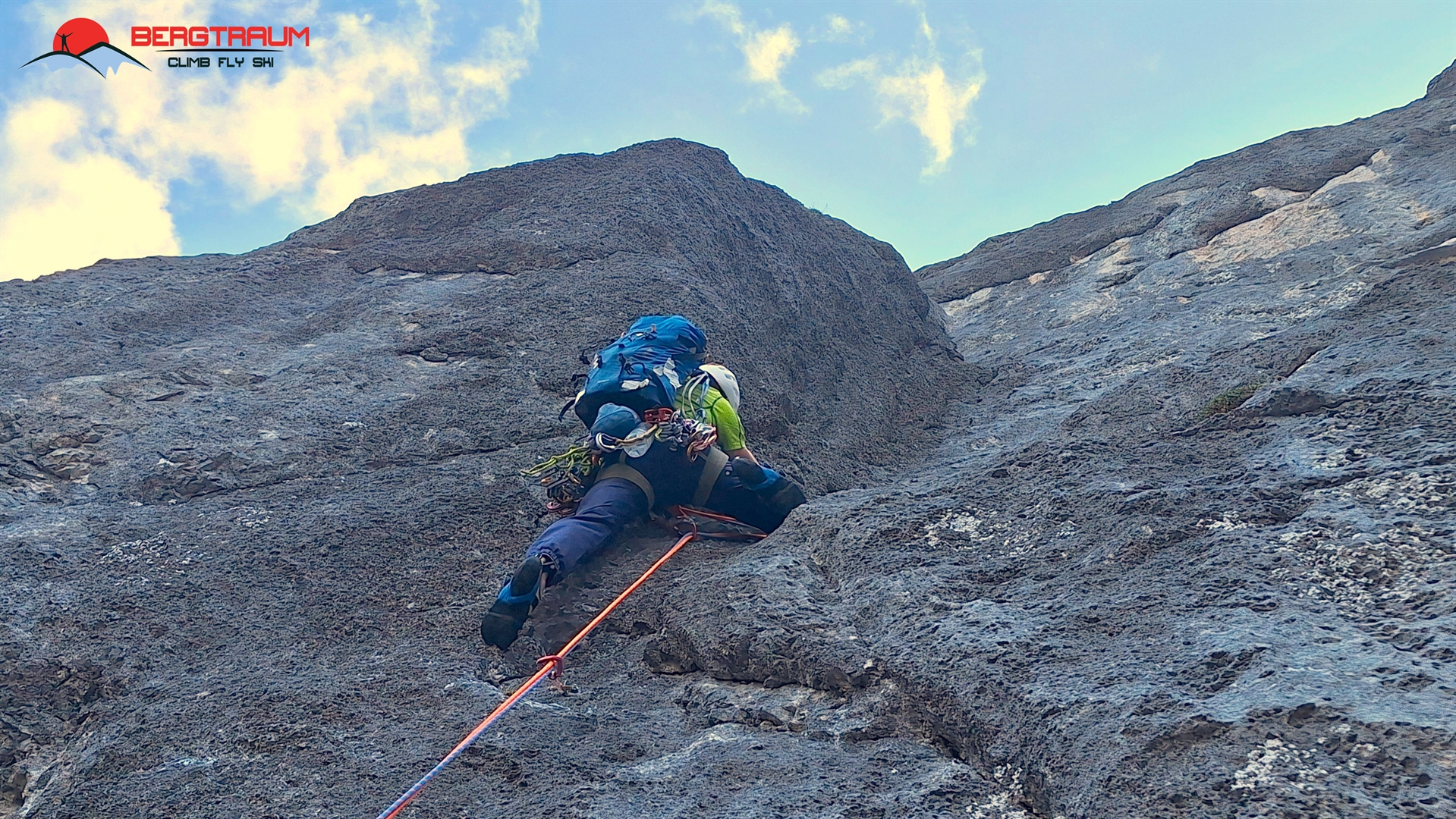Ausrüstung: komplettes Felskletterzeugs, 8 Expressen, 1-2 lange Schlingen, BD friends 0,3 bis 3, Doppelseil 50 m.