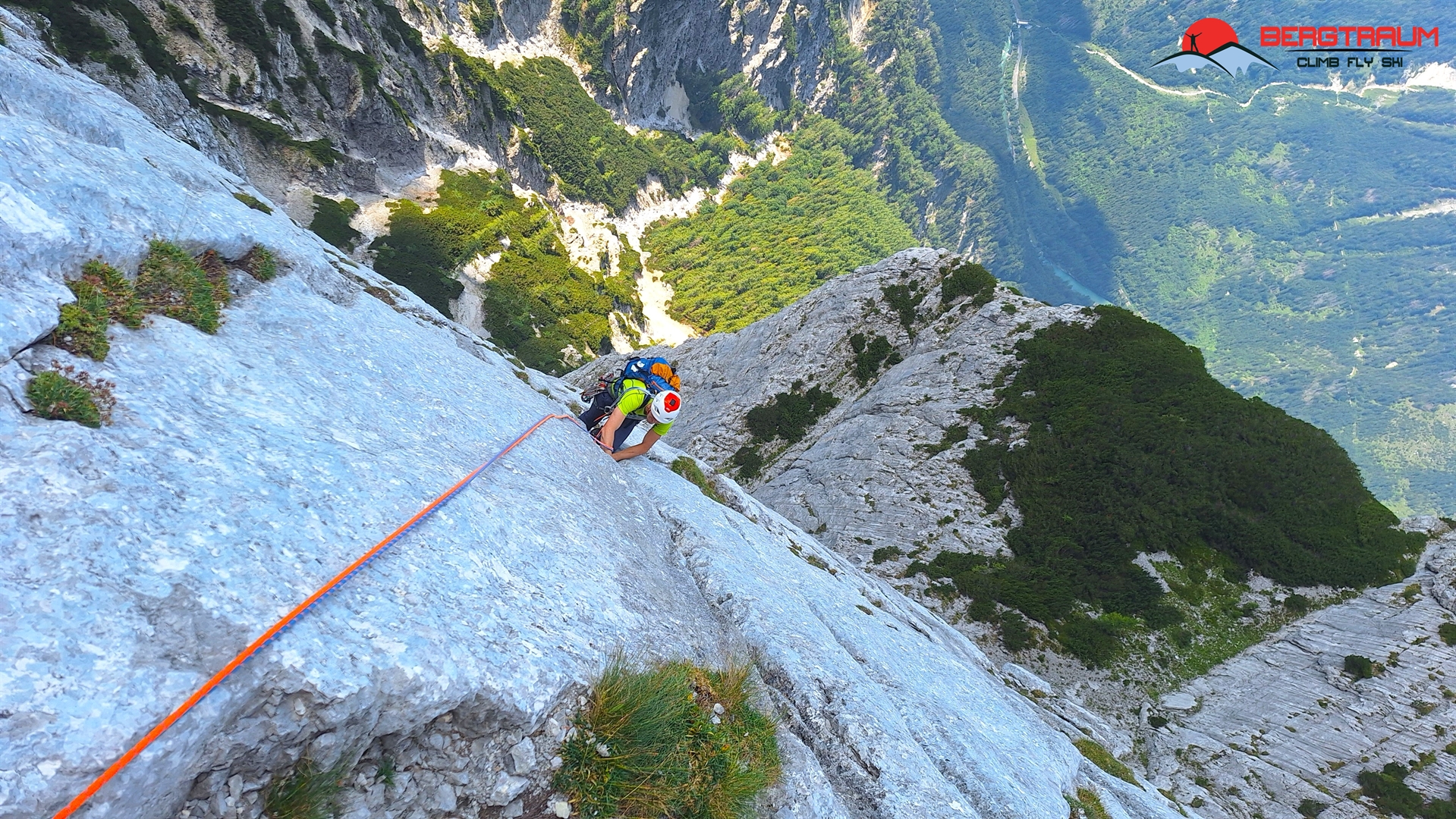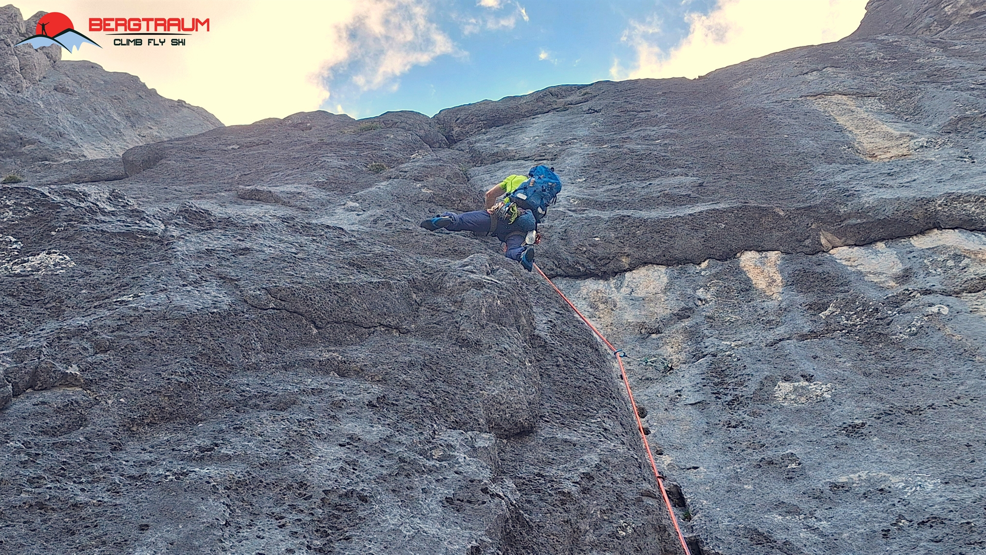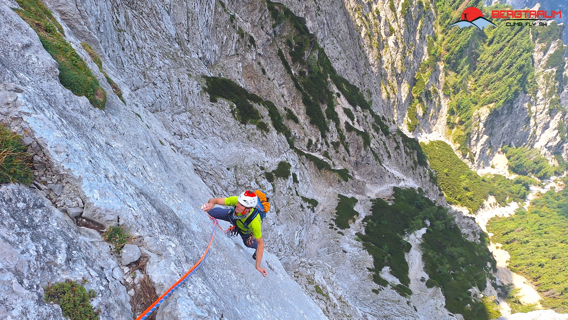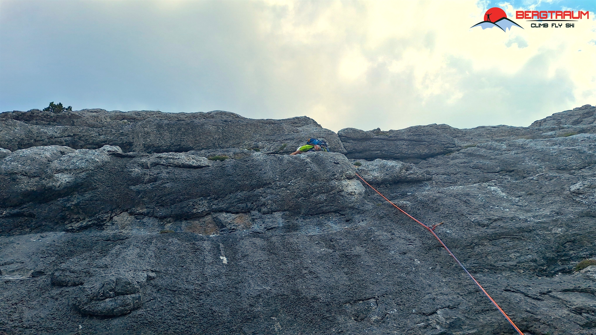 L7- 6b+: die Verschneidung hinauf, kurze Querung nach rechts (Zwischenstand möglich) und wieder entlang der Verschneidung weiter. Nun markante Rechtsquerung (Plattenstelle) zu Baum und Stand hinüber.