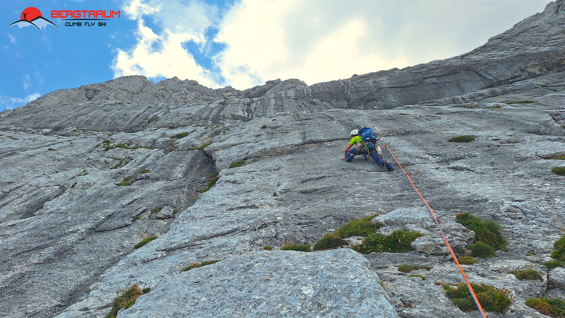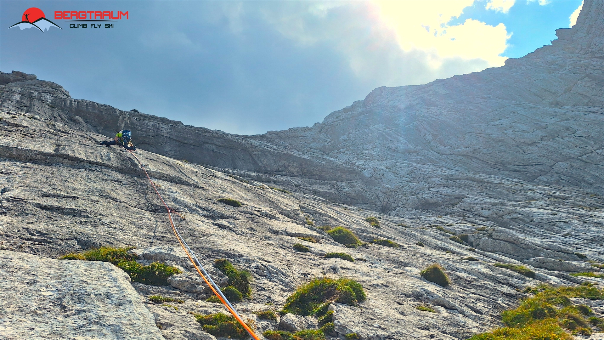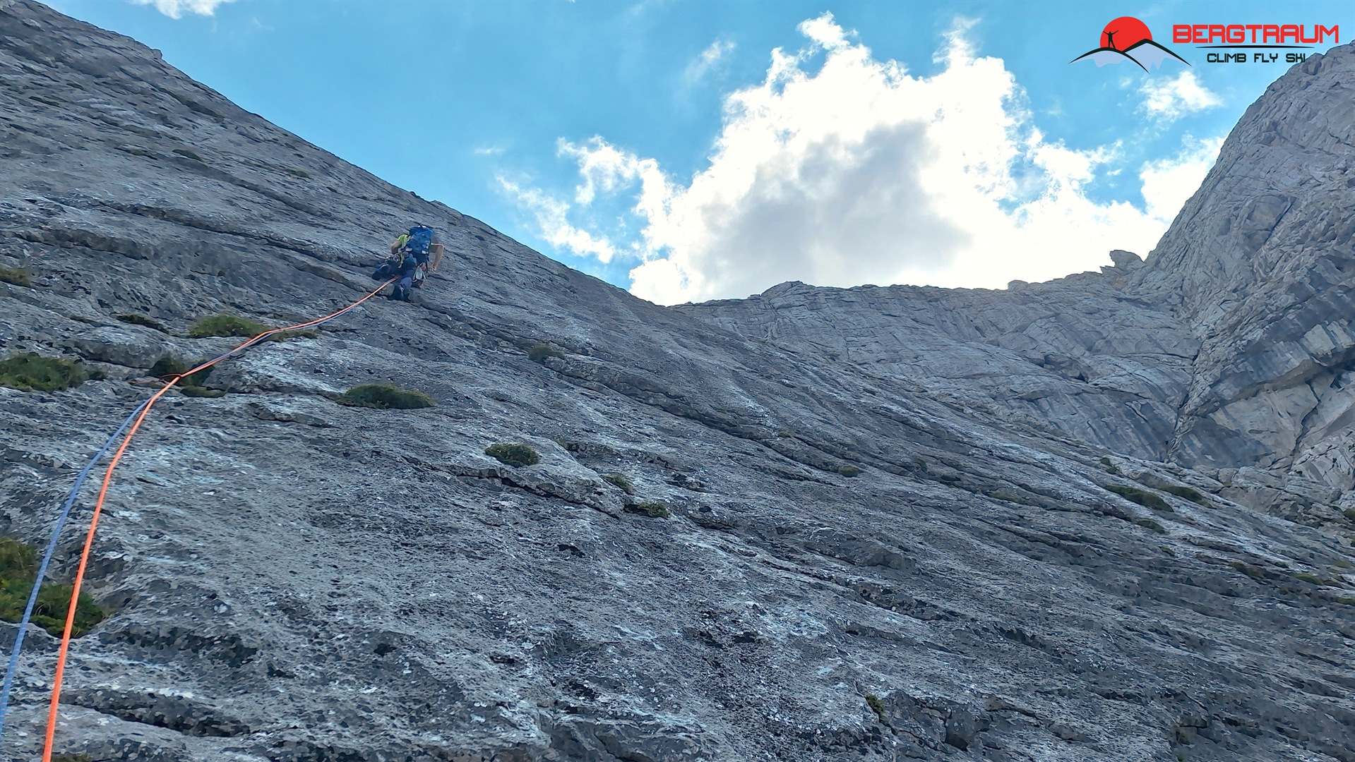 L9- 5: über eine seichte Verschneidung rauf zum Stand.