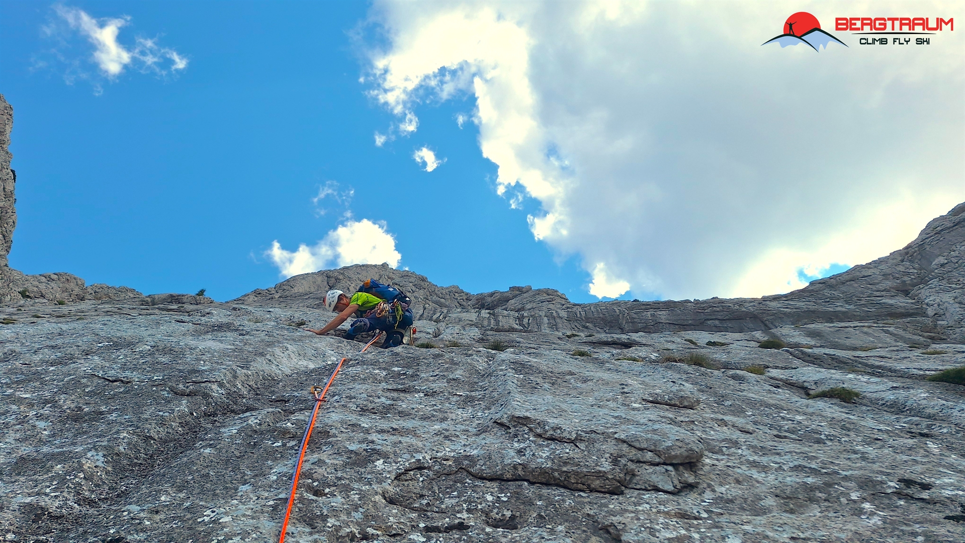 Bemerkungen: Durch die Sanierung im Jahr 2000 eine der besten Touren im Gseis. Tagesfüllend und im Gesamtanspruch nicht zu unterschätzen. Die Abstände der bolts sind teilweise echt weit. Nicht immer kann mit friends dazu gesichert werden. Im oberen Teil kann über die rechter Hand führende, leichtere Linie „Plattensprint“ ausgestiegen werden. Route ist grundsätzlich zum Abseilen eingerichtet.