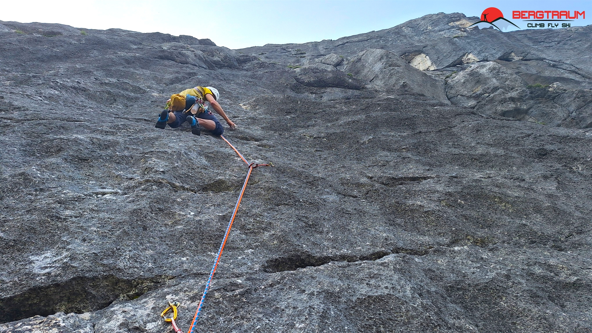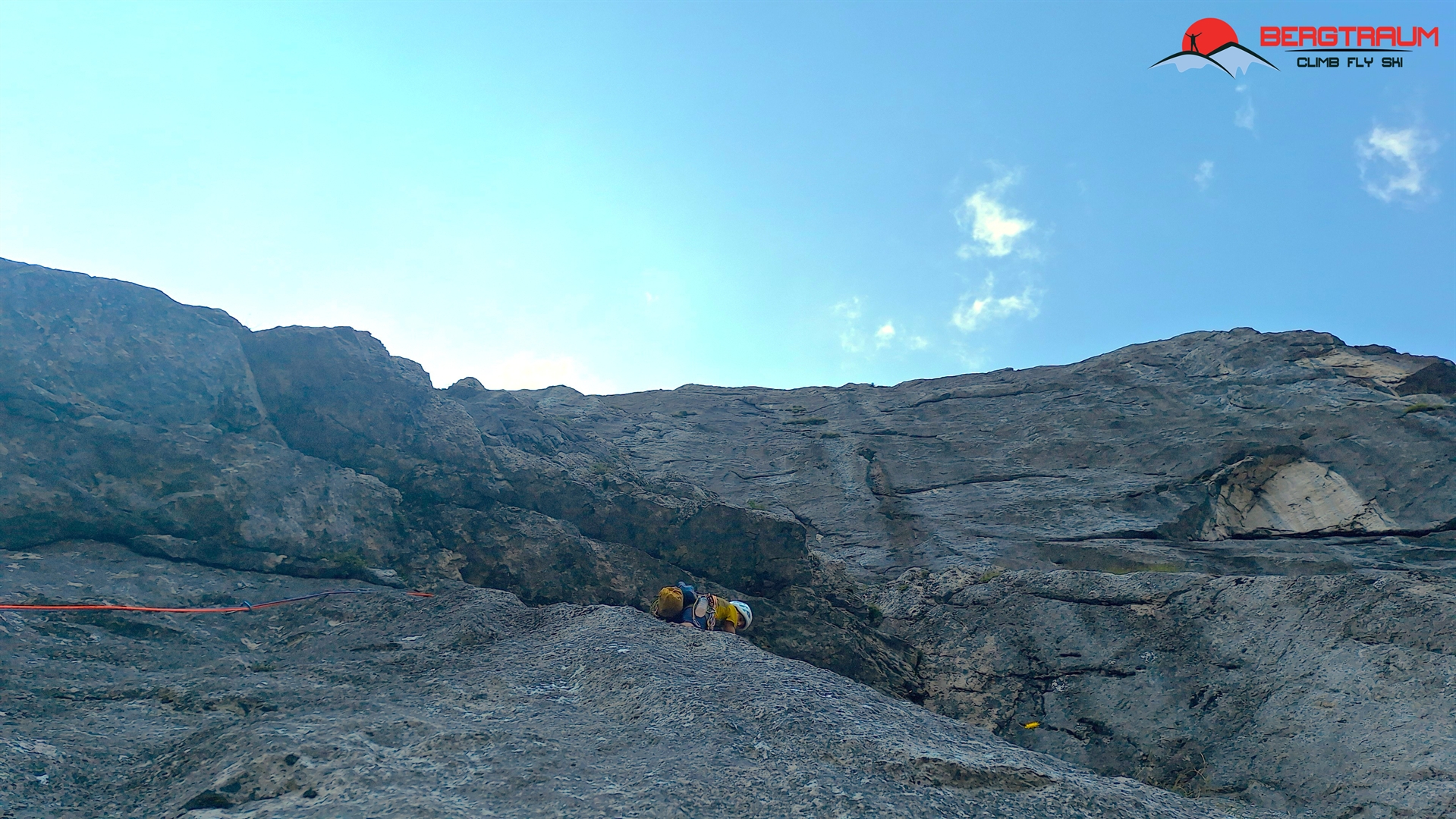 L3- 6+: vom Standplatz waagrechte Querung nach links, dann noch vor der Verschneidung unter dem großen Überhang plattig nach oben mit anschließender Rechtsquerung zu markanter Verschneidung. Diese gerade rauf und final leicht rechtshaltend zum Stand.