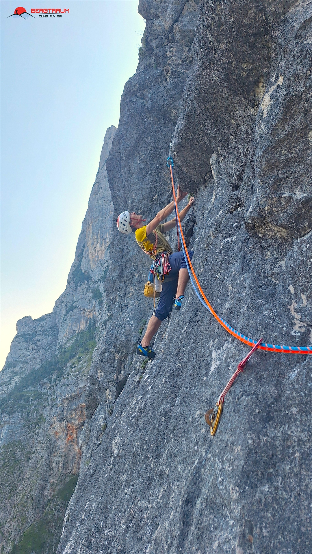 Bemerkungen: Trotz der Sanierung im Jahr 2007 noch immer nicht häufig begangene Route. Der Fels ist bombenfest, aber in der ersten Hälfte sehr sandig. Obwohl durchgehend geboltet, wurden an einigen neuralgischen Punkten Normalhaken bzw. alte Klemmkeile belassen. Lediglich fünf bis sieben bolts mehr hätten die Tour dann zu einer wirklichen 4- Sterne Tour gemacht. Der angegebene Schwierigkeitsgrad ist unserer Meinung nach seehr hart. Wir würden beim nächsten Mal einen Satz friends mitnehmen- der lohnt sich allemal!