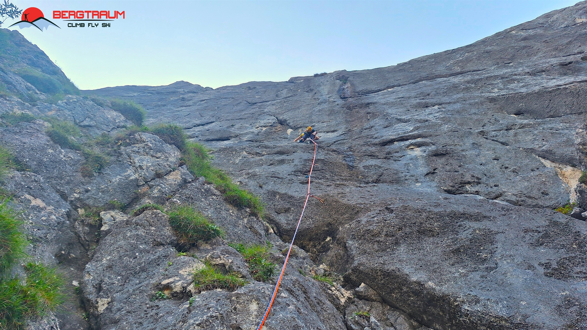 L1- 7-: steiler Einstieg über eine Wand gerade rauf. Beim Band markant wenige Meter nach rechts zum Standplatz.