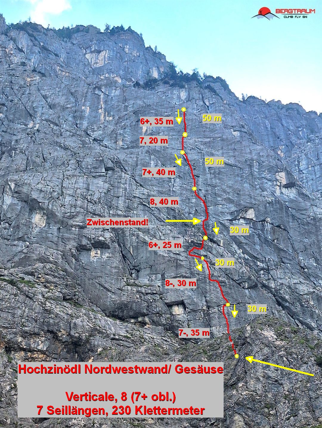 Hochzinödl Nordwestwand, „Verticale“: 8 (7+ obl.). Im Einzelnen: 7- (35 m), 8- (30 m), 6+ (25 m), 8- (40 m), 7+ (40 m), 7 (20 m), 6+ (35 m).