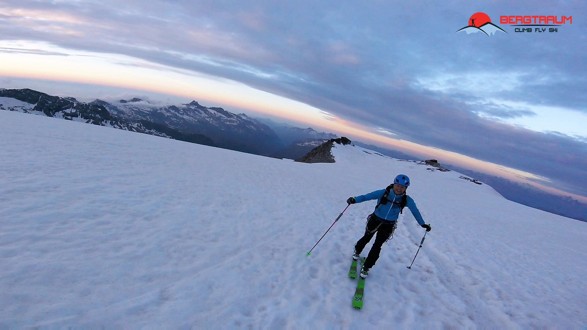 Wir schnallten dafür zum Ende des Ostgrates unsere Latten an und überzeugten uns von den perfekten Abfahrtsbedingungen: es waren einfach Top- Verhältnisse! Statt stundenlang in einer ausgetretenen Spur zu stapfen, schmierten wir bei Traumfirn in einem Zug bis zur Gnifettihütte runter- zehn Minuten für 800 Höhenmeter waren fast
