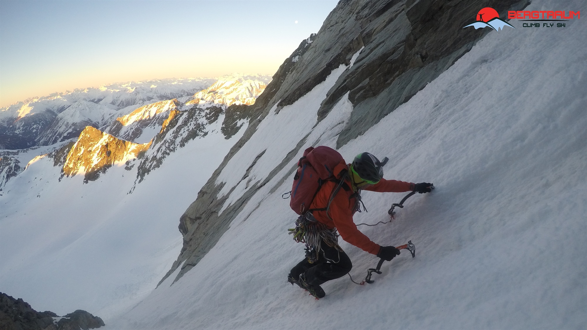 Wir waren ganz alleine im Winterraum der Stüdlhütte und genossen den Sonnenuntergang und die Ruhe dort oben. Andertags standen wir um 0700 Uhr unter der mächtigen Südwand und begannen mit der Kletterei. Wir waren noch immer allein und das war hier ganz besonders wichtig und gut. So konnte uns von oben (fast) nix mehr auf den Kopf fallen… Die Stapferei über den gefrorenen Schnee war perfekt, die