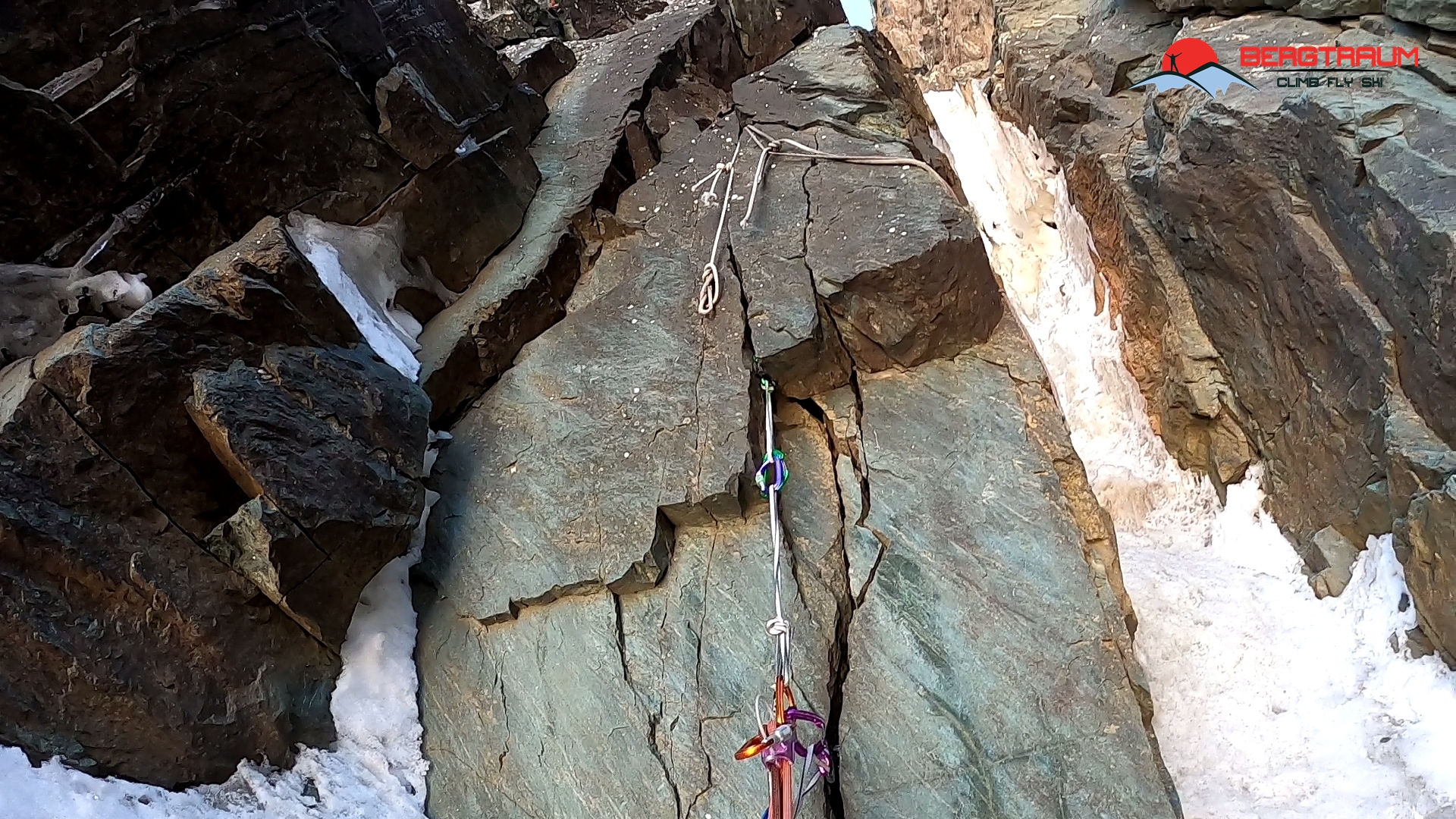 Schon bei den ersten Metern über brüchigen Fels, kombiniert mit einer dünnen und schlechten Eisauflage kam mein Tempo etwas ins Stocken. Die nachfolgende Rechtsquerung zum Durchschlupf hin war eine einzige Bastelei auf rohen Eiern. Und zu guter Letzt war dann nix mit „Durchschlupf“- der war nämlich zu! Also aussen leicht überhängend drüber: Zähne zusammen beißen, tief Luft holen, nicht an die kleinen Microfriends darunter denken und mit einigen kraftvollen Zügen raus aus diesem Teil! „Puh, ziemlich heftig- was sich wohl Markus unten am Stand gedacht hat?“