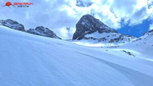 Streckenfliegern, die mit ihren Schirmen knapp über dem Gipfel Richtung Westen flogen. Über den Westgrat ging es nun hinunter, diesmal gespurt durch fünf Kollegen, die vom Gosausee raufgekommen waren. Ab der oberen Windlucke dann eine unglaublich schöne Abfahrt Richtung Adamekhütte runter. Ich schaffte es noch weitere 100 Höhenmeter tiefer abzufahren, dann war Schluss mit dieser Megaabfahrt.
